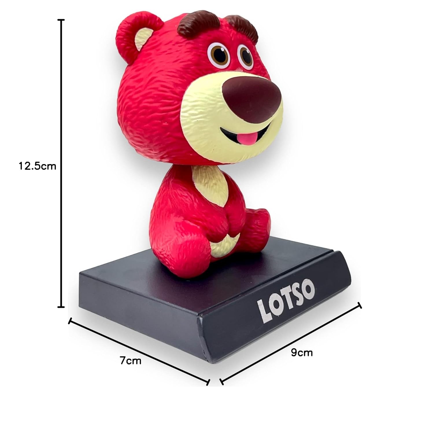 ¡Trae el aroma a fresas a tu colección! Este adorable Bobblehead de Lotso (Lots-o'-Huggin' Bear) de Toy Story captura perfectamente al icónico oso rosa con su característico color fucsia, nariz marrón y su expresión amigable. ¡Además funciona como soporte para tu celular!
