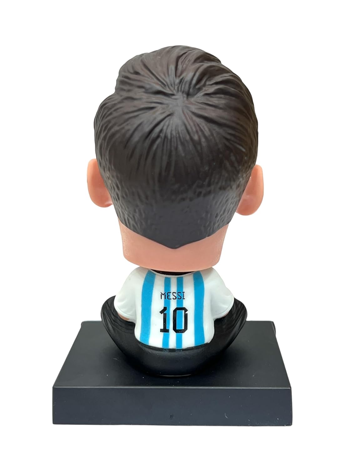 🇦🇷 La figura muestra a Messi con la icónica camiseta celeste y blanca de Argentina, sosteniendo un balón de fútbol con sus manos. Los detalles incluyen sus medias amarillas y la pose sentada característica. La cabeza tiene el clásico movimiento bobblehead que la hace aún más divertida y dinámica.