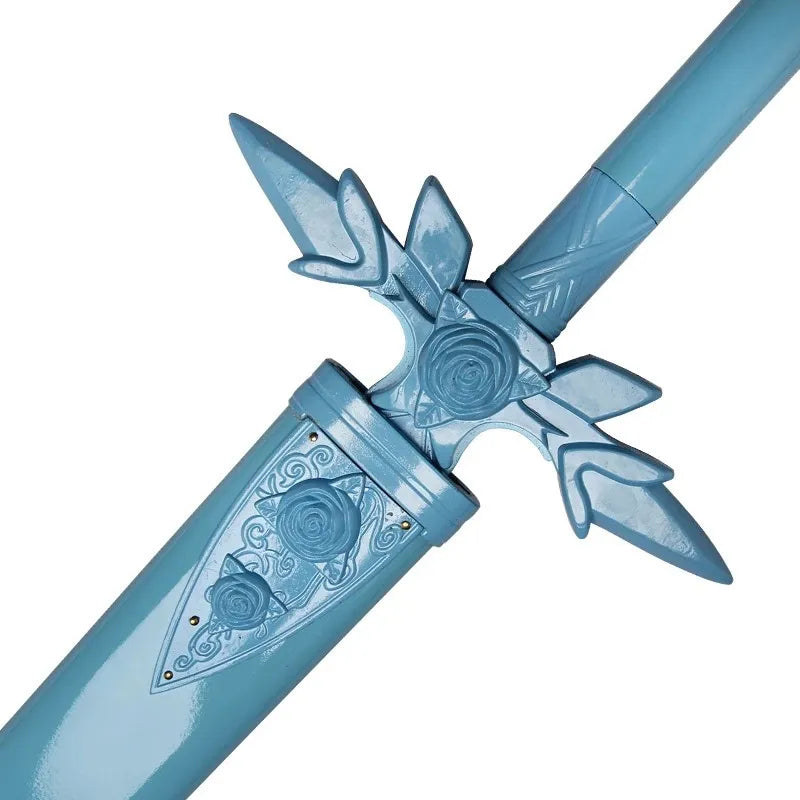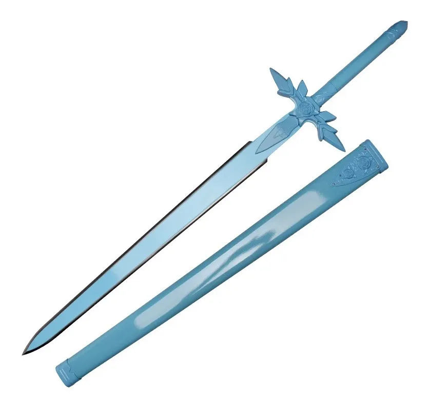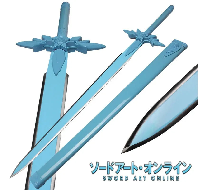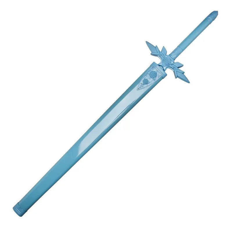 🎮 Réplica decorativa de la legendaria espada Elucidator, el arma principal de Kirito en Sword Art Online. Esta impresionante espada presenta una hoja negra/azul oscuro elegante, guarda en forma de cruz con detalles geométricos en azul claro, y viene con su hermosa vaina azul con grabados decorativos detallados.