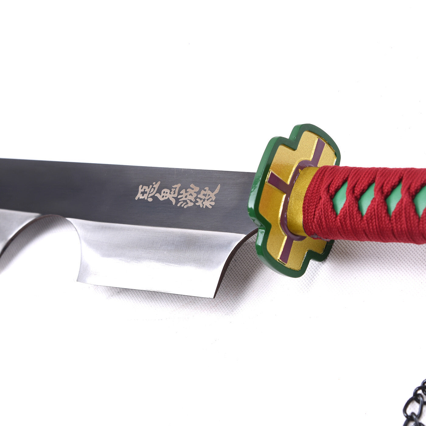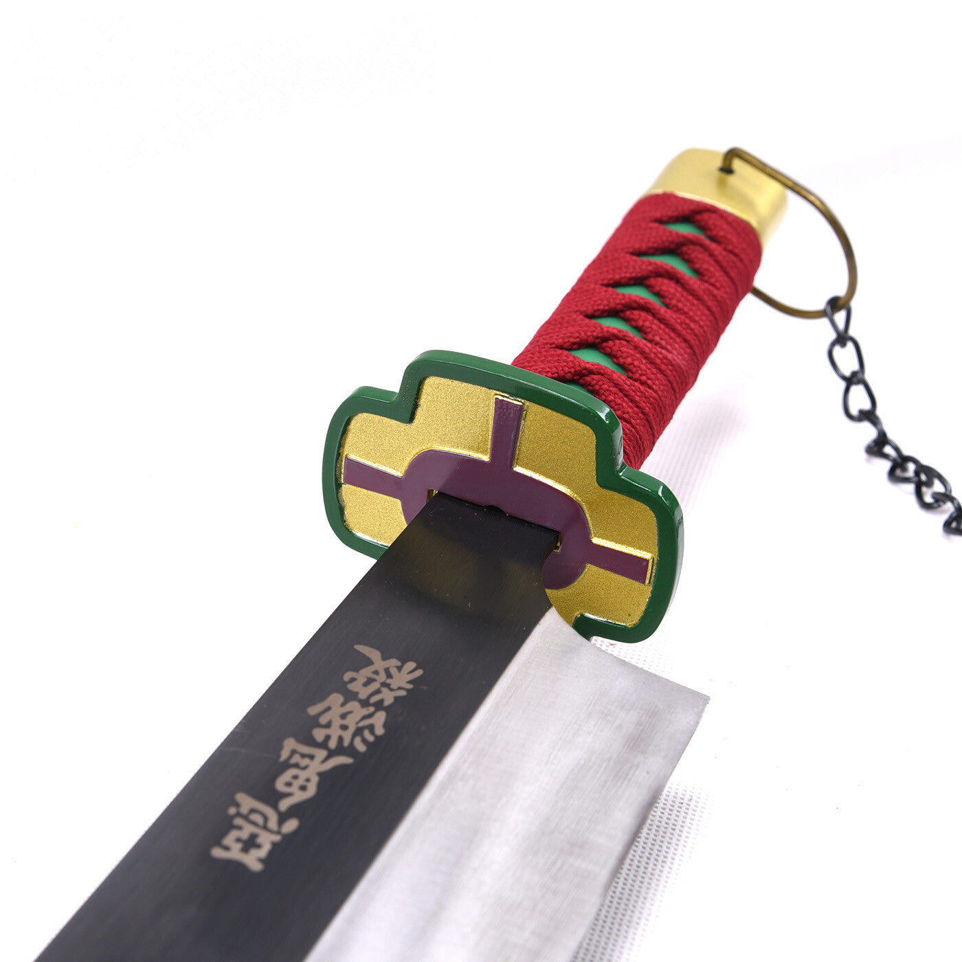 🗡️ Réplica decorativa de una de las legendarias Espadas Nichirin de Tengen Uzui, el Pilar del Sonido de Demon Slayer (Kimetsu no Yaiba). Esta explosiva espada presenta una hoja plateada/gris con degradado a negro, empuñadura roja envuelta con patrón de diamantes verdes/turquesa, guarda dorada con diseño característico, pomo dorado con cadena, y vaina negra.