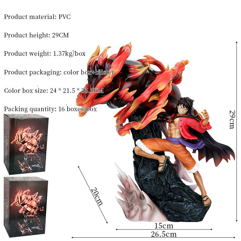 Esta impresionante figura de 29cm captura uno de los momentos más poderosos de Monkey D. Luffy en One Piece. El futuro Rey de los Piratas desata todo su poder con un espectacular efecto de fuego rojo y naranja que envuelve la escena en una explosión de energía pura. 💥