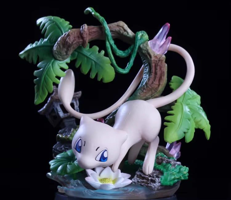 🌿 Los detalles del escenario son excepcionales: un árbol retorcido con ramas que se entrelazan alrededor de Mew, hojas verdes exuberantes, flores rosadas delicadas, y vegetación tropical que recrea su hábitat en la selva. La figura muestra a Mew en una pose flotante natural, con sus pequeñas patas y orejas puntiagudas perfectamente esculpidas. Incluye base circular negra con detalles rosados para exhibición estable.
