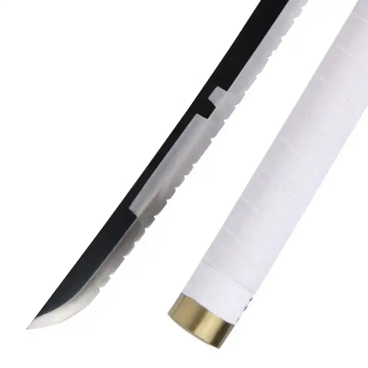 💀 Réplica decorativa de la legendaria Katana de Kenpachi Zaraki, el Capitán de la 11va División en Bleach. Esta brutal katana presenta una hoja plateada recta dentada/mellada, vaina blanca con bandas negras, empuñadura blanca envuelta, guarda dorada con diseño geométrico facetado/angular, y pomo dorado.