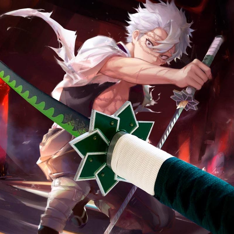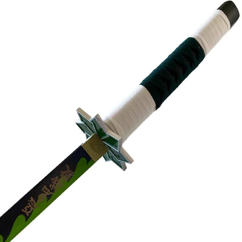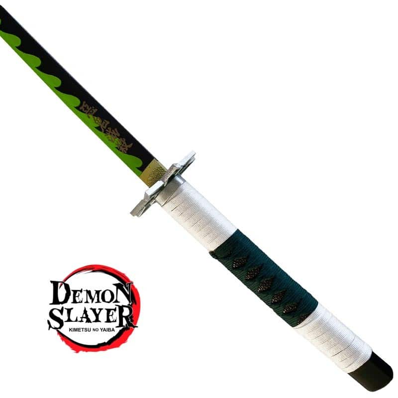 🗡️ Réplica decorativa de la legendaria Katana Nichirin de Sanemi Shinazugawa, el Pilar del Viento de Demon Slayer (Kimetsu no Yaiba). Esta feroz katana presenta una hoja verde con patrón de escamas/hexágonos negros, vaina negra con bandas blancas, empuñadura blanca envuelta con secciones negras, guarda verde con diseño de estrella/flor de ocho pétalos, y pomo dorado.