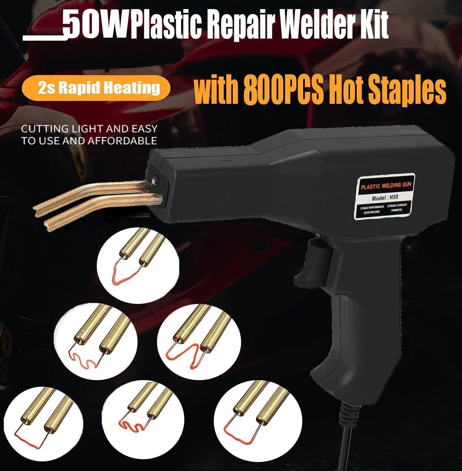 El Kit Soldador de Plástico 50W es la solución definitiva para reparar todo tipo de plásticos. Con 800 grapas calientes de 6 tipos diferentes y calentamiento rápido en 2 segundos, repara parachoques, tableros, faros y más.