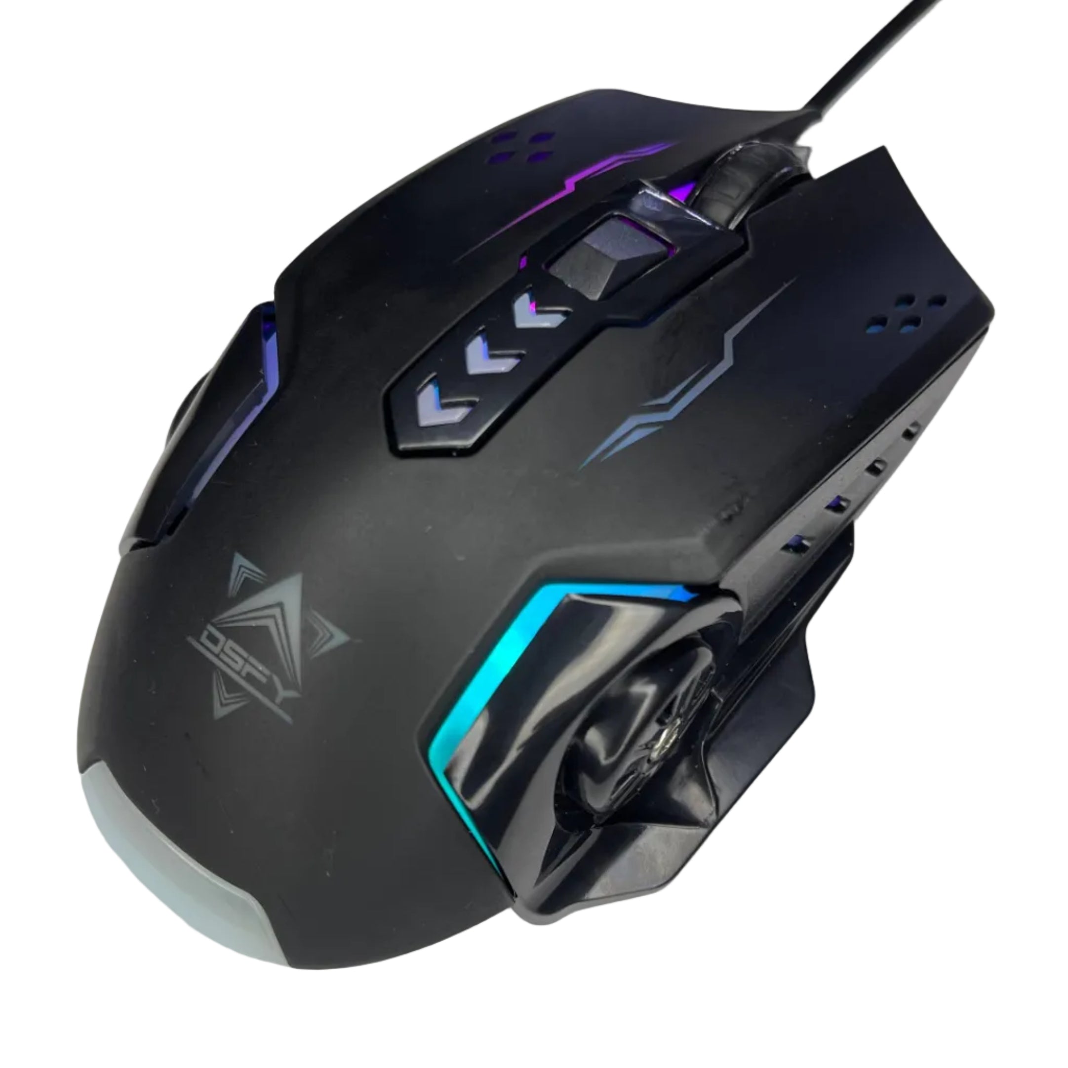 El Mouse Gamer X9 cuenta con un impresionante sistema de iluminación LED RGB que no solo se ve increíble, sino que también indica el nivel de DPI activo. Las luces crean un efecto visual espectacular que complementa cualquier setup gaming.
